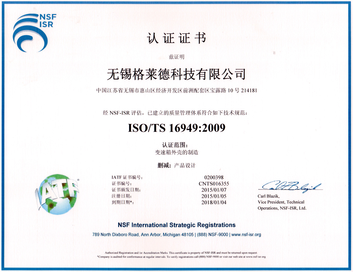 “顧客的需要就是格萊德人的需要”,我們以技術創新為先導,引進國內外領先的生產技術和先進的TPS管理模式,以完善的過程控制體系確保工藝品質。目前,我公司已具備年產汽車零部件、通用機械壓鑄件130萬套的生產能力,工藝水平先進,技術力量雄厚,質量管理完善。目前公司正進行TS16949國際汽車質量體系的認證、ISO9001質量體系認證、ISO14001 環境質量體認證。